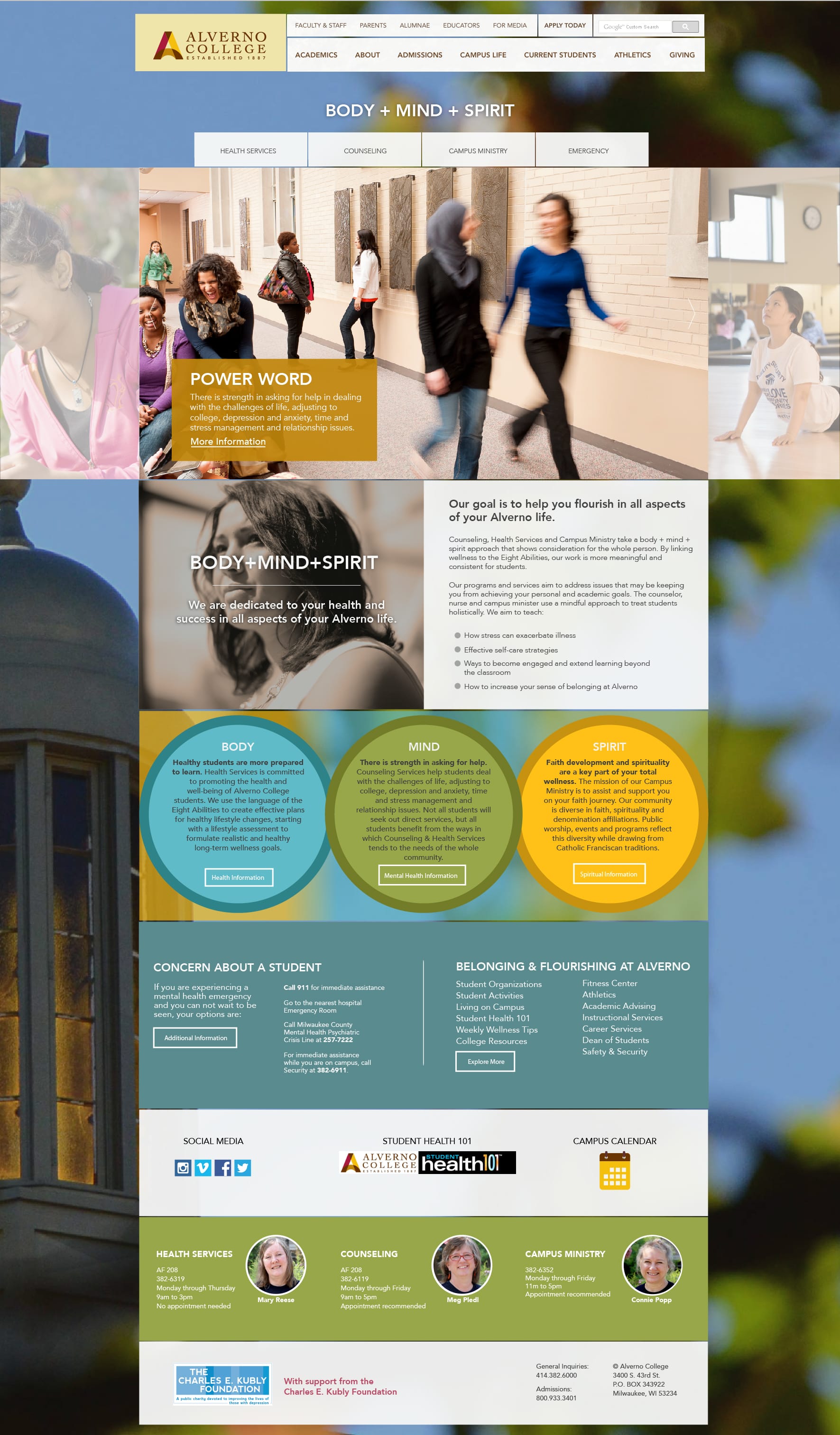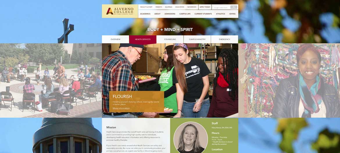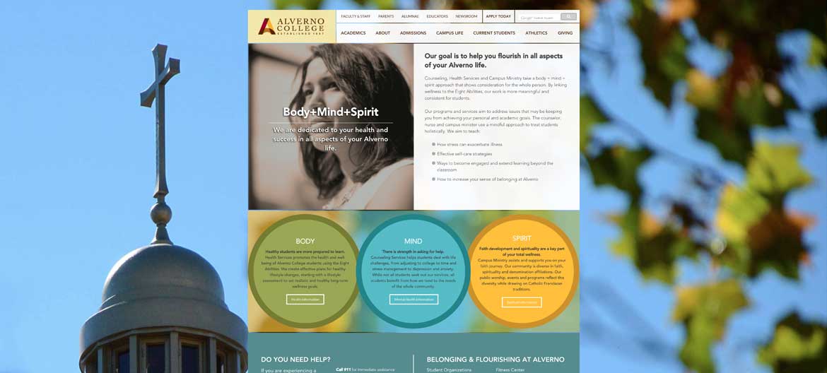 Ascedia’s copywriting team distilled the information provided by Alverno’s team into the Body + Mind + Spirit microsite. These pages contain all of the relevant information on health services, counseling, campus ministry and emergency services, giving students the tools they need to flourish in all aspects of their life on campus.