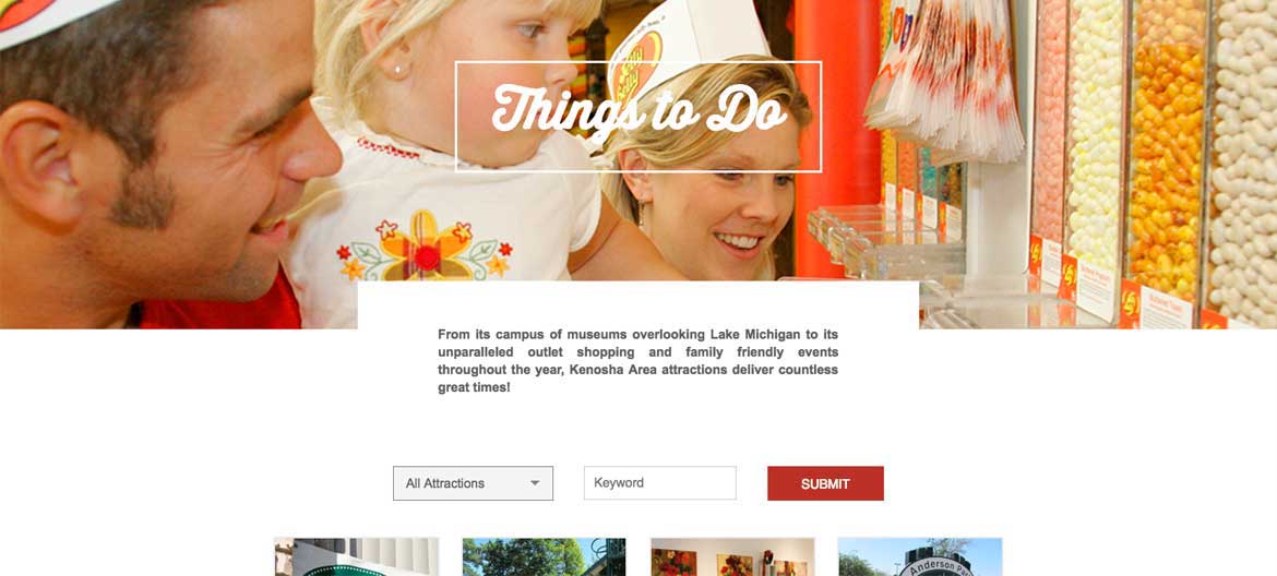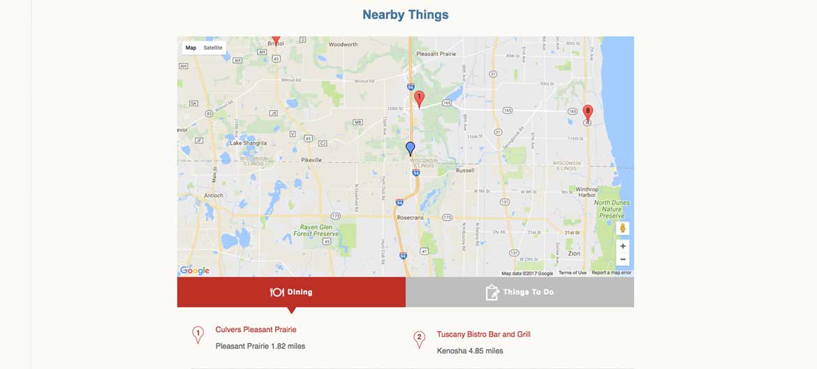 Our research identified that most visitors to the Visit Kenosha website were visiting the area for business or to attend a sporting event. A goal became getting these travelers to discover all of the interesting and exciting attractions the Kenosha Area has to offer. This resulted in the development of a “Nearby Things” map that shows visitors restaurants and attractions that are close to their destination.