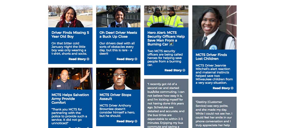 An Excellence section of the site showcases personal stories and rider experiences. These stories reflect the impact MCTS services and employees have on the community at large.