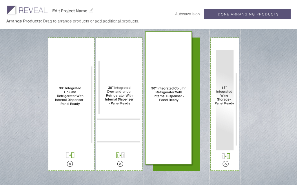 The Reveal Configurator helps users: quickly select products, fine tune details for installation, choose accessories accessories, arrange products with the click and drag of a mouse, and save multiple design configurations.