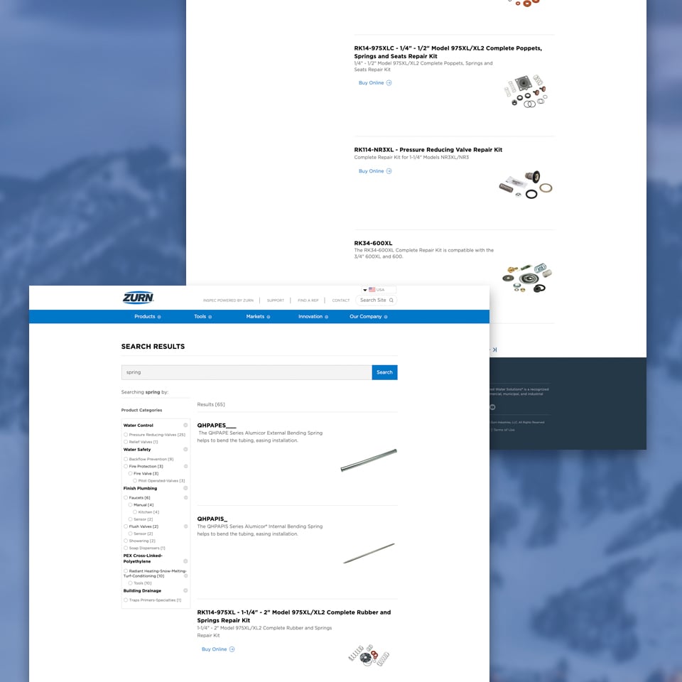 Today, Zurn has an all-encompassing search tool where users could search for products, tools, or documentation from any starting point and in any language. They could search by SKU#, partial SKU#, or high-level keywords. Because we implemented within Zurn’s website platform, it had a native feel for administrators. They had the capacity to update or add new products and metadata independently. By providing a clear UX and development strategy, Zurn’s site is easy to follow and manage, and is flexible for future product and e-commerce needs.